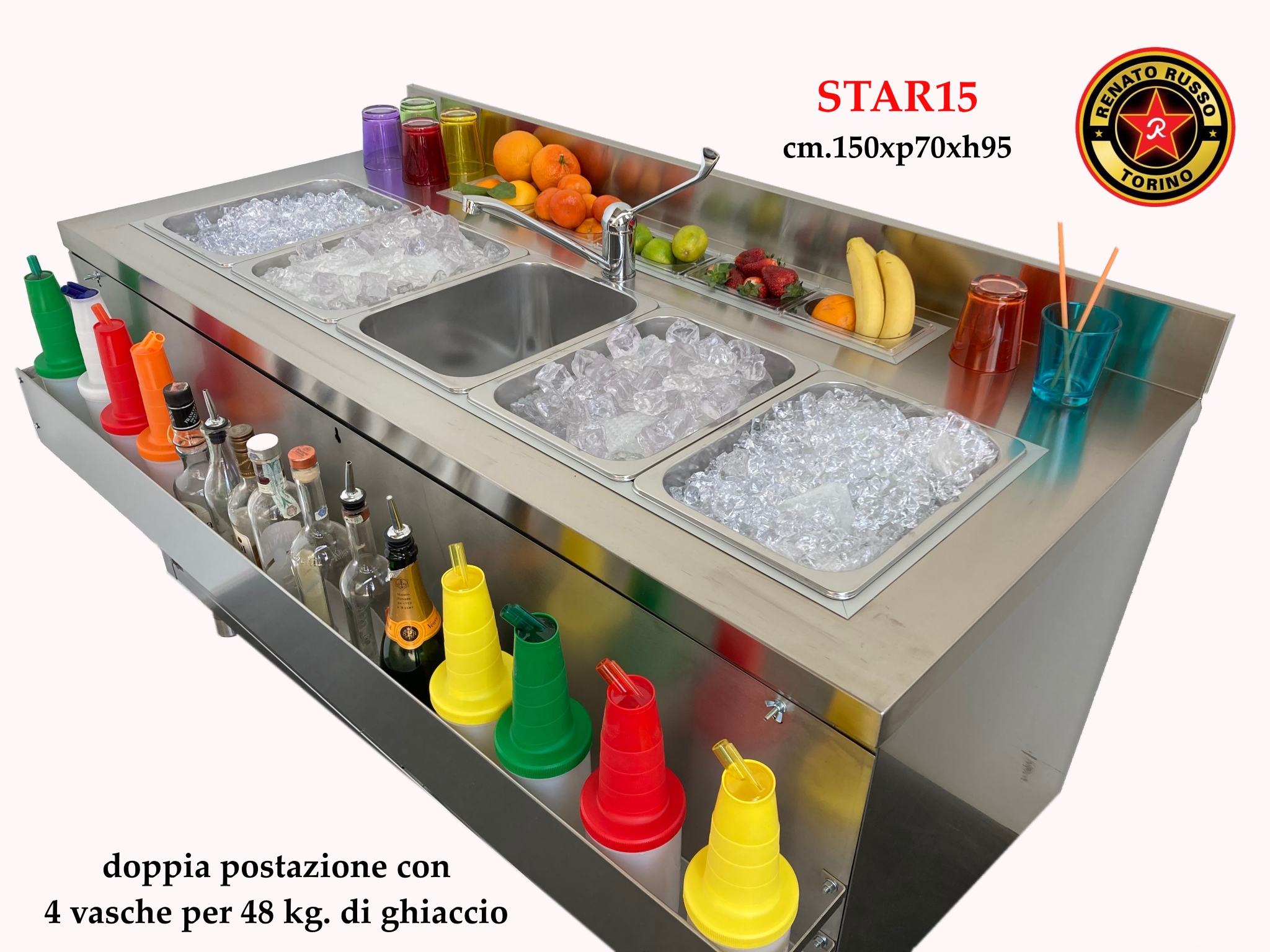 Nuova cocktail station professionale. Art. K15. Misure: cm.150xp70xh105 Composta da grande vasca (con divisori removibili) di cm.74x44 dentro la quale ci sono 2 vani per il gliaccio, 2 vani per bottiglie, 4 vascette pe rla frutta. Lavello con miscelatore, tasca portabottiglie, ripiano intermedio, top con alzatina e bancalina/piano servizio cliente. La vasca è dotata di scarico e pilette. VEDI QUI